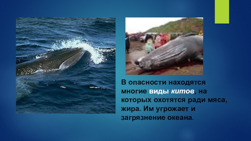 Слайд 15В опасности находятся многие виды китов, на которых охотятся ради мяса,