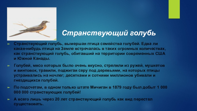 А всего лишь через 20 лет странствующий голубь как вид перестал существовать.