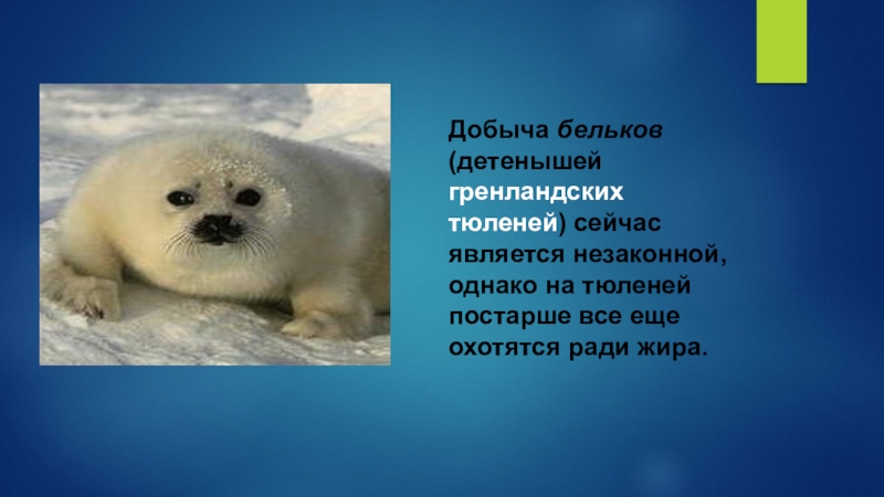 Слайд 12Добыча бельков (детенышей гренландских тюленей) сейчас является незаконной, однако на тюленей