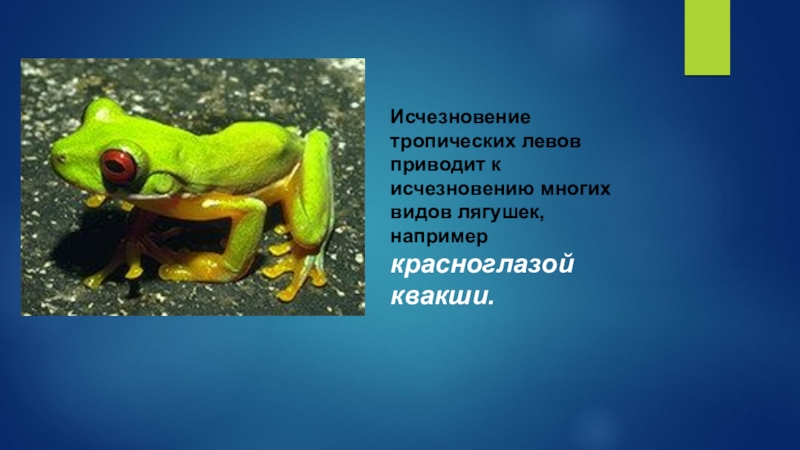 Слайд 10Исчезновение тропических левов приводит к исчезновению многих видов лягушек, например красноглазой