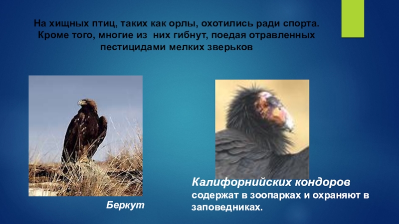 Слайд 18На хищных птиц, таких как орлы, охотились ради спорта. Кроме того,
