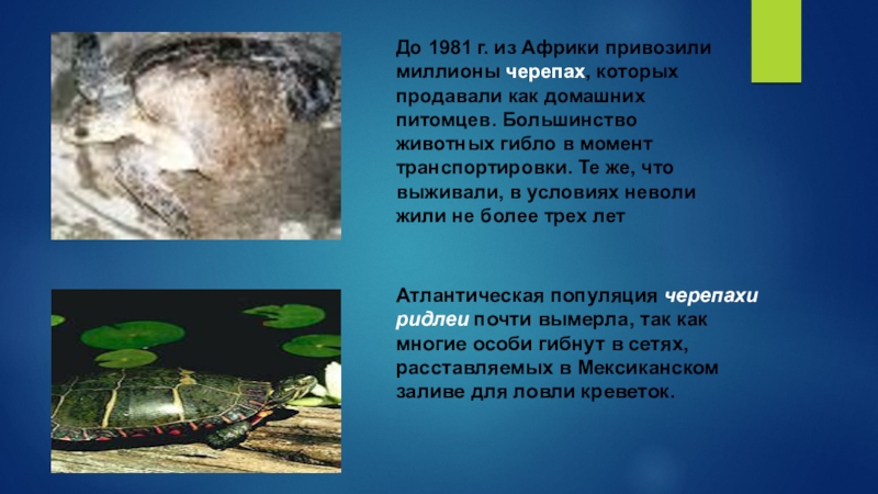 Слайд 16До 1981 г. из Африки привозили миллионы черепах, которых продавали как