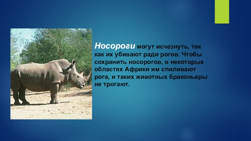 Слайд 8Носороги могут исчезнуть, так как их убивают ради рогов. Чтобы сохранить