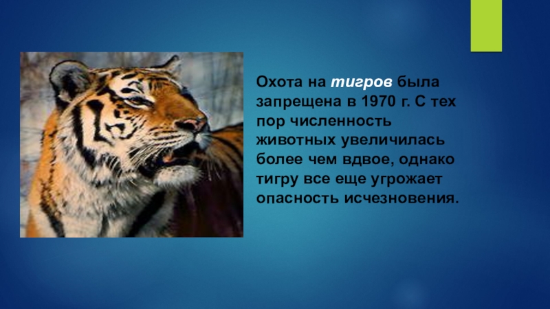 Слайд 9Охота на тигров была запрещена в 1970 г. С тех пор