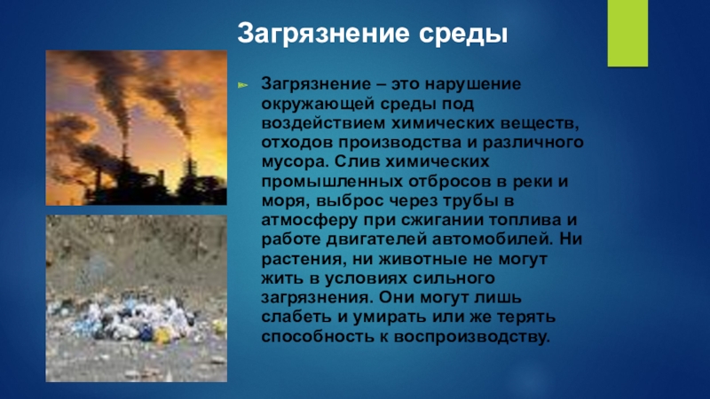 отходов производства и различного мусора. Слив химических промышленных отбросов в реки и моря, выброс через трубы в атмосферу при сжигании топлива и работе двигателей автомобилей. Ни растения, ни животные не могут жить в условиях сильного загрязнения. Они могут лишь слабеть и умирать или же терять способность к воспроизводству.