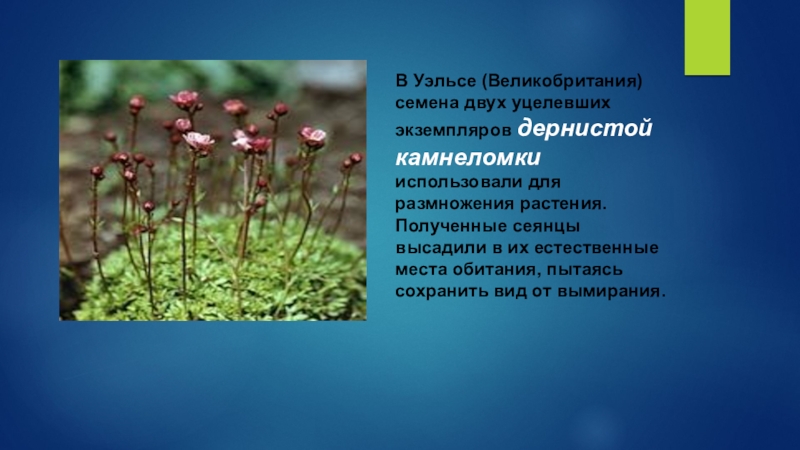Слайд 11В Уэльсе (Великобритания) семена двух уцелевших экземпляров дернистой камнеломки использовали для