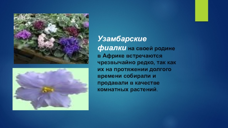 Слайд 13Узамбарские фиалки на своей родине в Африке встречаются чрезвычайно редко, так