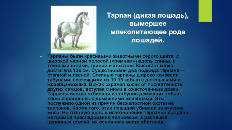 Слайд 5Тарпан (дикая лошадь), вымершее млекопитающее рода лошадей.