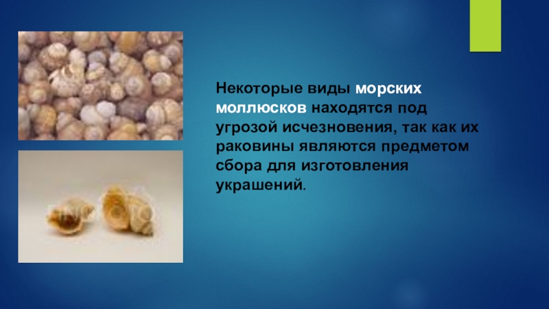 Слайд 14Некоторые виды морских моллюсков находятся под угрозой исчезновения, так как их