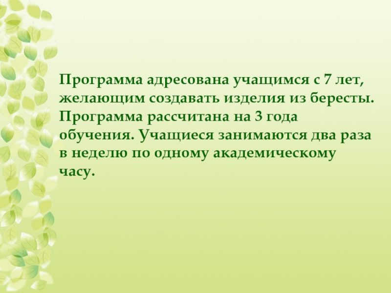Слайд 38Программа адресована учащимся с 7 лет, желающим создавать изделия из бересты.