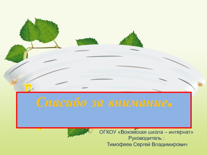 «Берестяная сказка»ОГКОУ «Вохомская школа – интернат» Руководитель : Тимофеев Сергей ВладимировичСпасибо за внимание.