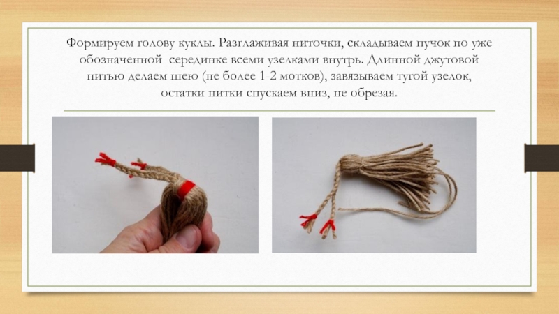 Слайд 13Формируем голову куклы. Разглаживая ниточки, складываем пучок по уже обозначенной серединке