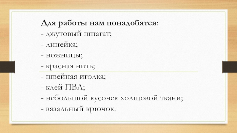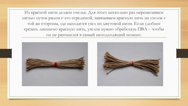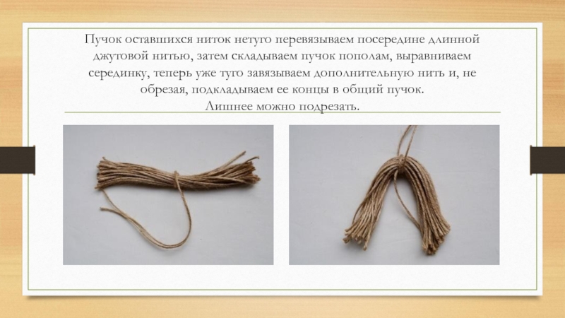 Слайд 10Пучок оставшихся ниток нетуго перевязываем посередине длинной джутовой нитью, затем складываем