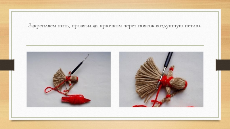 Слайд 16Закрепляем нить, провязывая крючком через поясок воздушную петлю.
