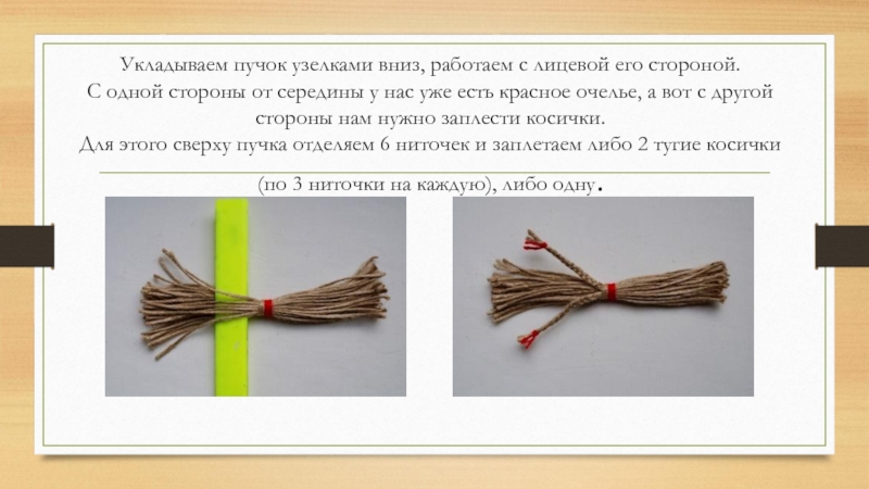 Слайд 12Укладываем пучок узелками вниз, работаем с лицевой его стороной.