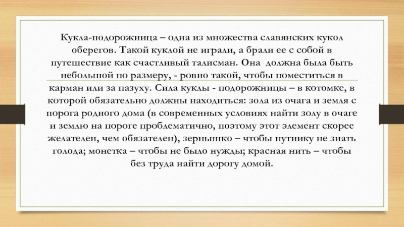 Слайд 2Кукла-подорожница – одна из множества славянских кукол оберегов. Такой куклой не