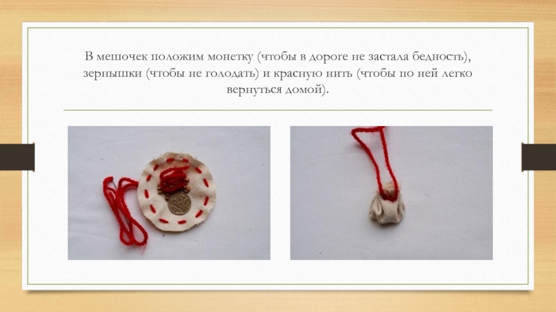 Слайд 20В мешочек положим монетку (чтобы в дороге не застала бедность), зернышки