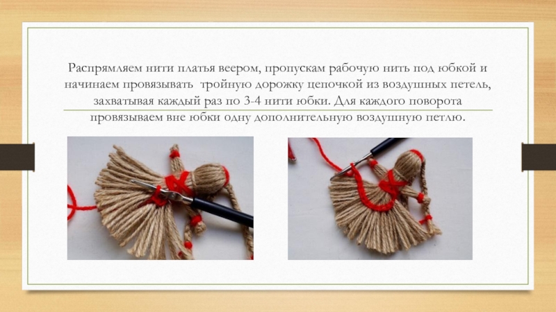Слайд 17Распрямляем нити платья веером, пропускам рабочую нить под юбкой и начинаем