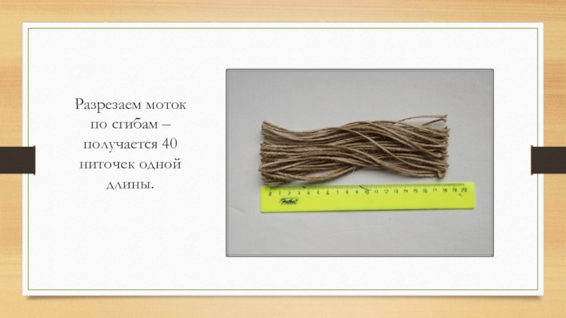 Слайд 6Разрезаем моток по сгибам – получается 40 ниточек одной длины.
