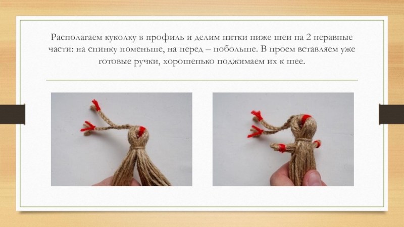 Слайд 14Располагаем куколку в профиль и делим нитки ниже шеи на 2
