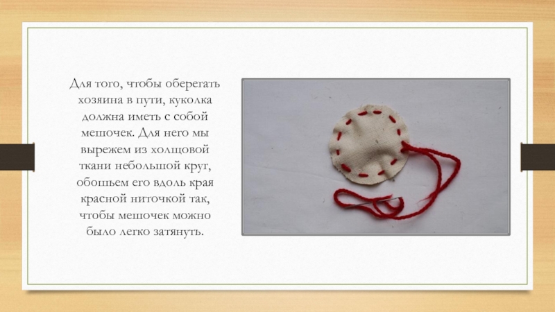 собой мешочек. Для него мы вырежем из холщовой ткани небольшой круг, обошьем его вдоль края красной ниточкой так, чтобы мешочек можно было легко затянуть.
