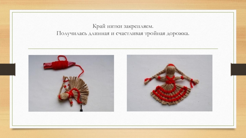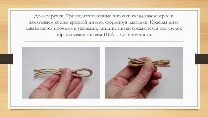 Слайд 8Делаем ручки. Три подготовленные ниточки складываем втрое и заматываем концы красной