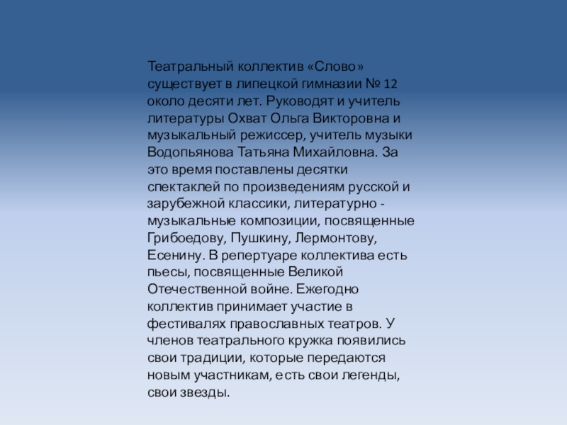 Театральный коллектив «Слово» существует в липецкой гимназии № 12 около десяти лет. Руководят и учитель литературы Охват Ольга Викторовна и музыкальный режиссер, учитель музыки Водопьянова Татьяна Михайловна. За это время поставлены десятки спектаклей по произведениям русской