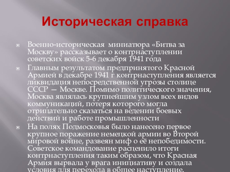 Историческая справкаВоенно-историческая миниатюра «Битва за Москву» рассказывает о контрнаступлении советских войск 5-6 декабря 1941 годаГлавным результатом предпринятого