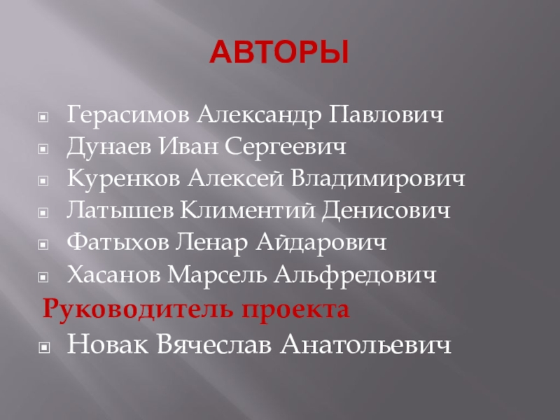 АВТОРЫГерасимов Александр ПавловичДунаев Иван СергеевичКуренков Алексей ВладимировичЛатышев Климентий ДенисовичФатыхов Ленар АйдаровичХасанов Марсель АльфредовичРуководитель проектаНовак Вячеслав Анатольевич