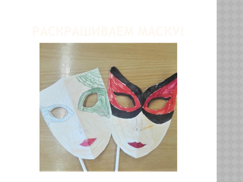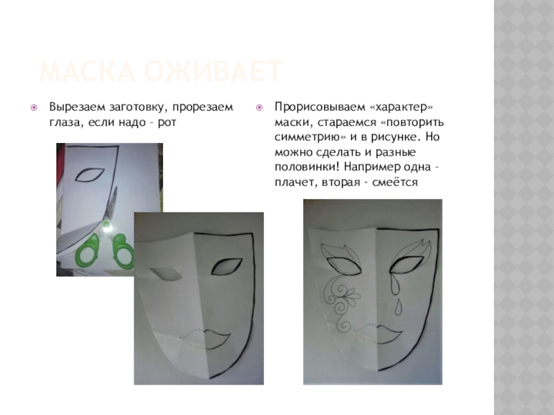 маски, стараемся «повторить симметрию» и в рисунке. Но можно сделать и разные половинки! Например одна – плачет, вторая - смеётся