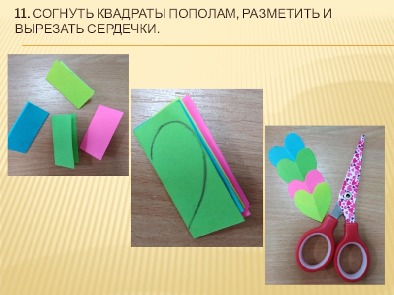 11. Согнуть квадраты пополам, разметить и вырезать сердечки.