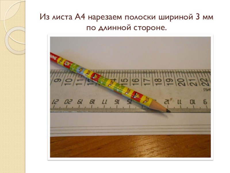 Слайд 4Из листа А4 нарезаем полоски шириной 3 мм по длинной стороне.