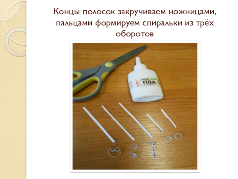 Слайд 6Концы полосок закручиваем ножницами, пальцами формируем спиральки из трёх оборотов