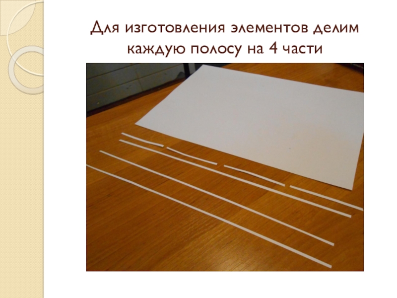 Слайд 5Для изготовления элементов делим каждую полосу на 4 части