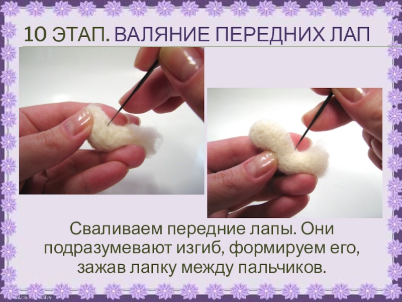 10 этап. Валяние передних лапСваливаем передние лапы. Они подразумевают изгиб, формируем его, зажав лапку между пальчиков.
