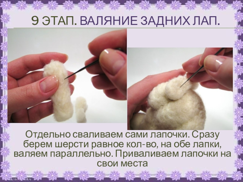 9 этап. Валяние задних лап.Отдельно сваливаем сами лапочки. Сразу берем шерсти равное