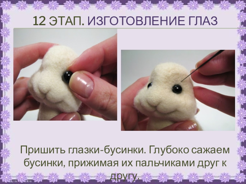 12 этап. Изготовление глазПришить глазки-бусинки. Глубоко сажаем бусинки, прижимая их пальчиками друг к