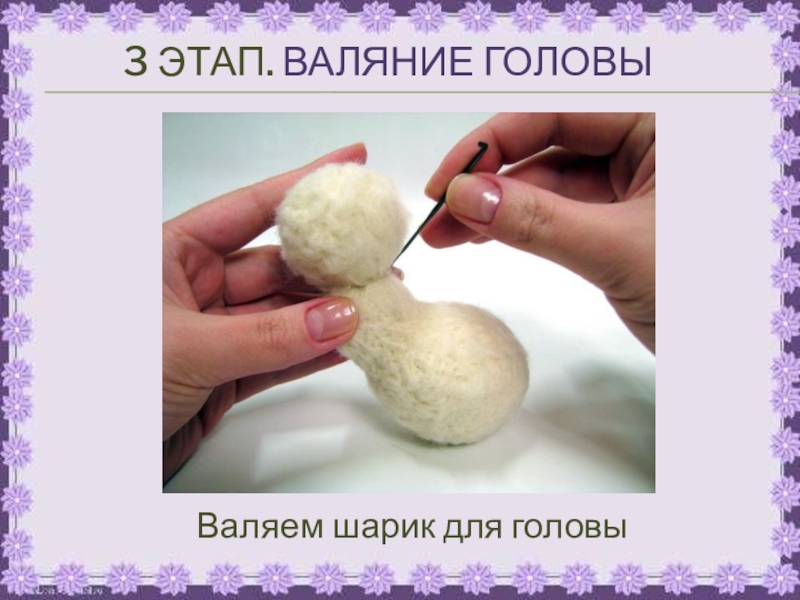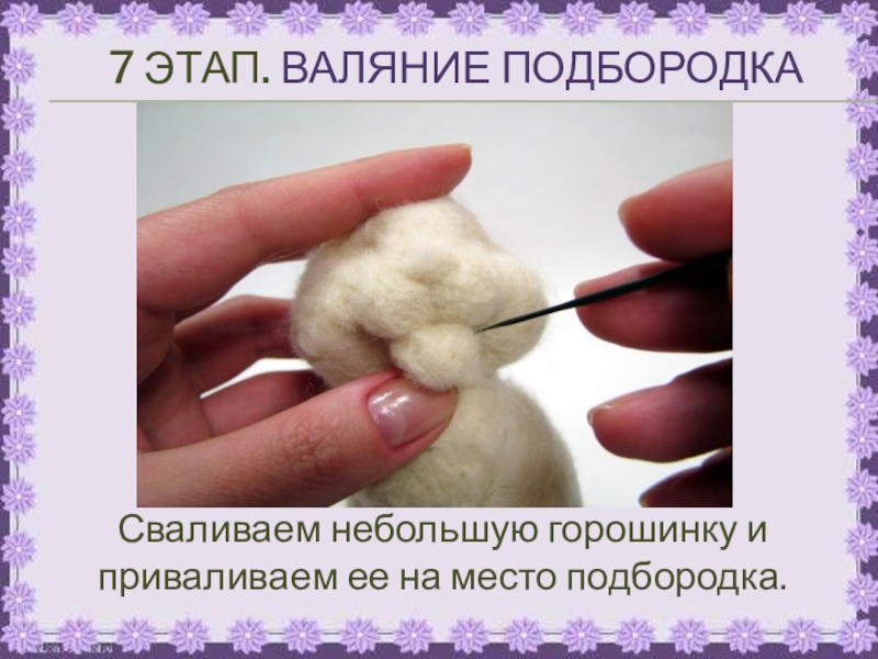 7 этап. Валяние подбородкаСваливаем небольшую горошинку и приваливаем ее на место подбородка.