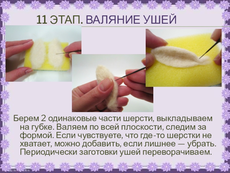 11 этап. Валяние ушей Берем 2 одинаковые части шерсти, выкладываем на губке. Валяем по всей плоскости, следим