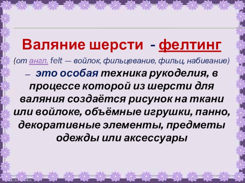 Валяние шерсти  - фелтинг (от англ. felt — войлок, фильцевание, фильц, набивание) — это особая техника рукоделия, в процессе которой из