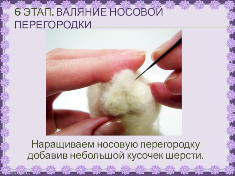6 этап. Валяние носовой перегородкиНаращиваем носовую перегородку добавив небольшой кусочек шерсти.