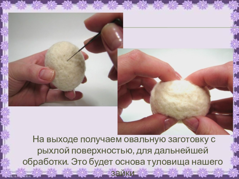 На выходе получаем овальную заготовку с рыхлой поверхностью, для дальнейшей обработки. Это будет основа туловища нашего зайки