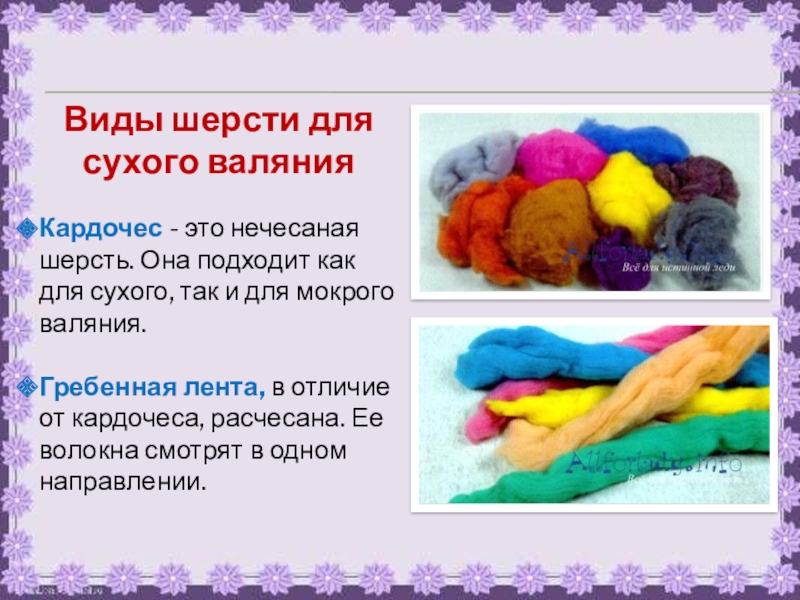 Виды шерсти для сухого валянияКардочес - это нечесаная шерсть. Она подходит как для сухого, так и для
