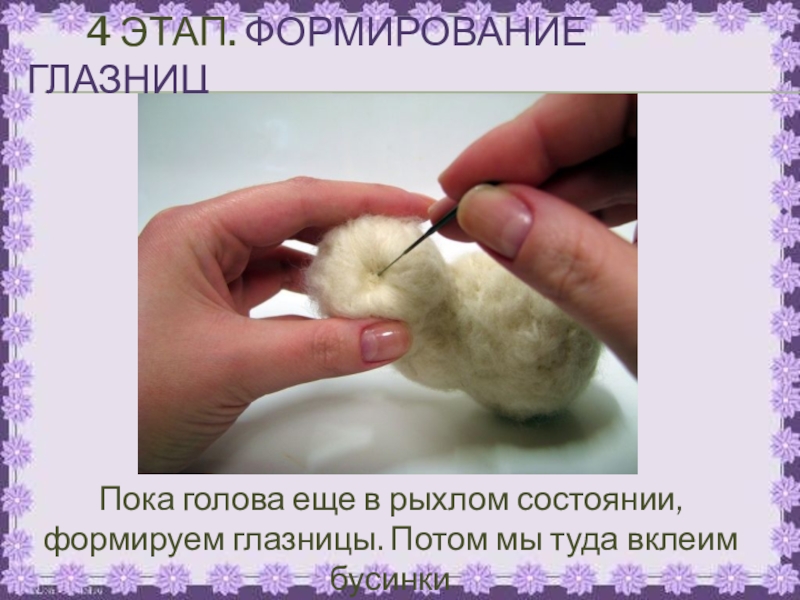 рыхлом состоянии, формируем глазницы. Потом мы туда вклеим бусинки