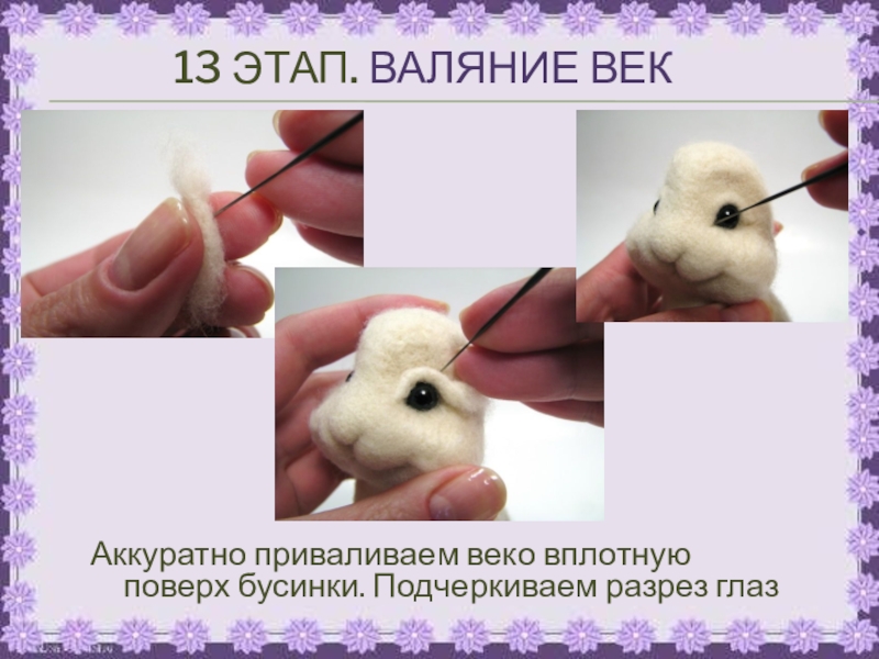 13 этап. Валяние векАккуратно приваливаем веко вплотную поверх бусинки. Подчеркиваем разрез глаз