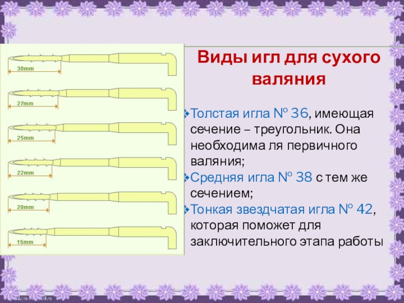 Виды игл для сухого валянияТолстая игла № 36, имеющая сечение – треугольник. Она необходима ля первичного валяния;Средняя