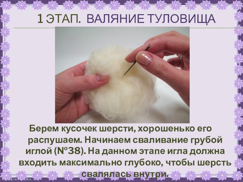 1 этап. Валяние туловищаБерем кусочек шерсти, хорошенько его распушаем. Начинаем сваливание грубой