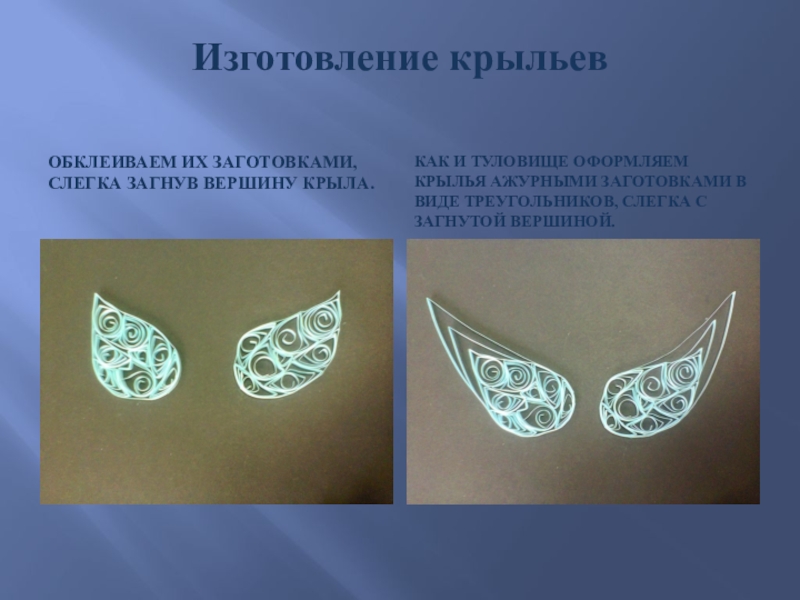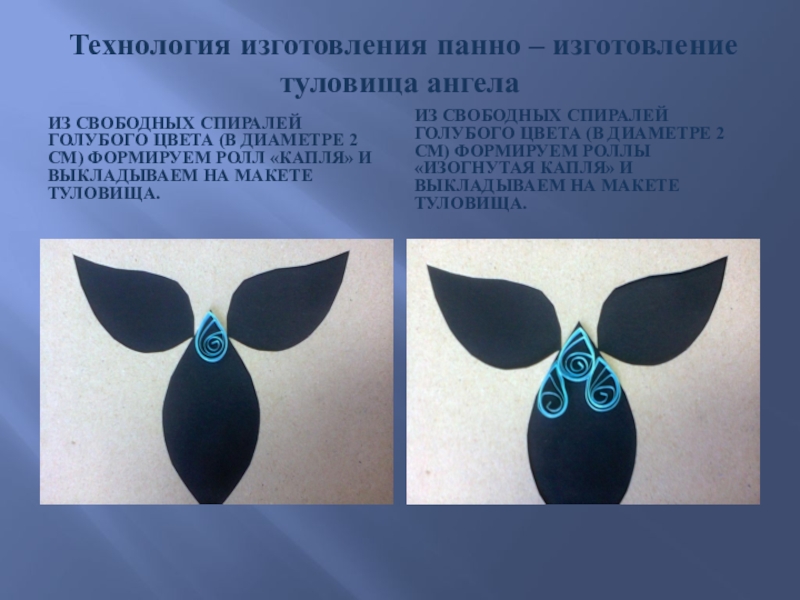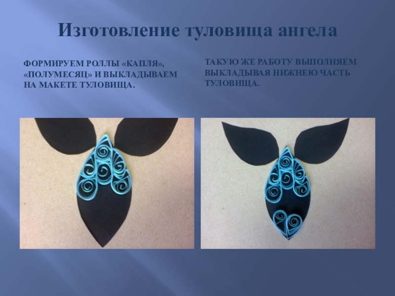 Из свободных спиралей голубого цвета (в диаметре 2 см) формируем роллы «изогнутая капля» и выкладываем на макете туловища.