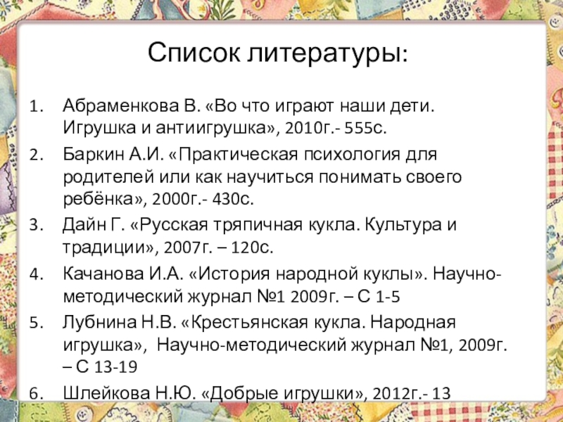 Лубнина Н.В. «Крестьянская кукла. Народная игрушка», Научно-методический журнал №1, 2009г. – С 13-19