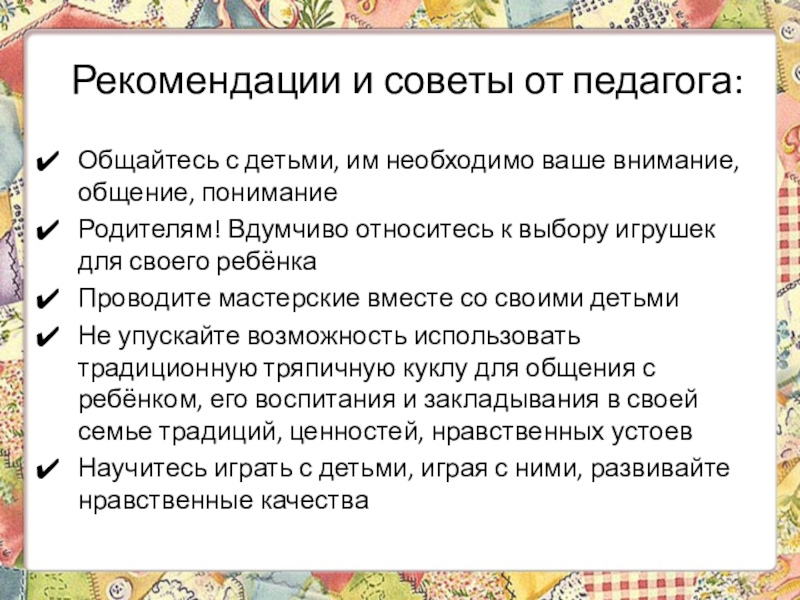Не упускайте возможность использовать традиционную тряпичную куклу для общения с ребёнком, его воспитания и закладывания в своей семье традиций, ценностей, нравственных устоев